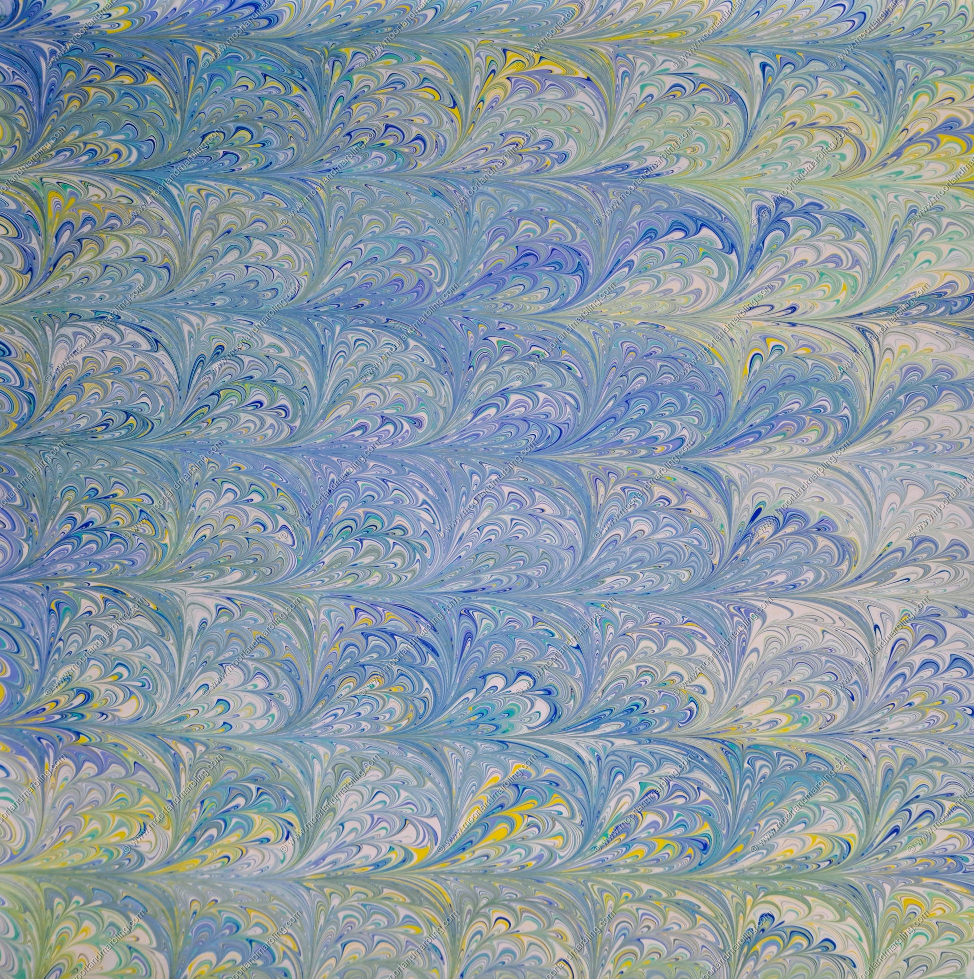 A soft mixture of blues and yellows finished with a "Double American" marbling pattern.