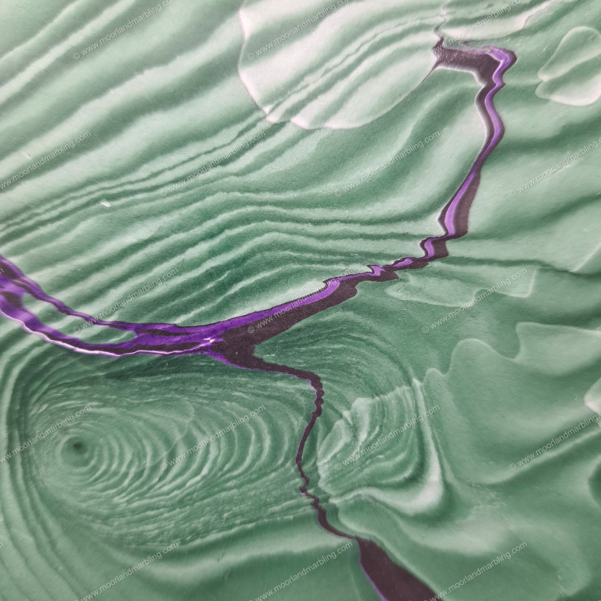 Earthy green tones veined with a decadent purple. Finished with a "Spanish Moire" marbling effect to mimic the distinctive pattern of this unusual mineral.